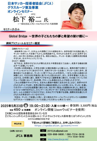 2025年5月、日本サッカー指導者協会(JFCA)主催のグラスルーツ普及セミナーにて、GlobalBridgePlus代表・松下裕二が講演を行いました。
